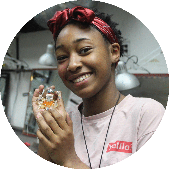 “Many things inspire me to make art, but the most prominent is the zone I get into when I am making art. The zone is where nothing else truly matters besides creating the vision I see in my mind.” -C’Zarriah, 16, 2018 Camper and Fuego Youth Leader in Glass Flameworking
