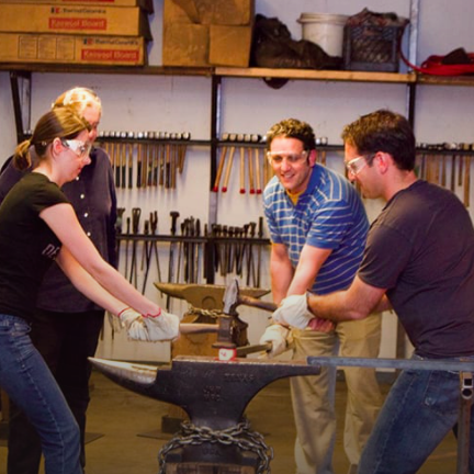 Team Building Workshops are for corporate, nonprofit, and private groups of friends, co-workers, or colleagues. These fun, hands-on workshops are a great bonding experience that boosts morale, lowers stress, and stimulates creative thinking, while teaching techniques in welding, glass fusing, flameworking, blacksmithing, woodturning, and more. Workshops are scalable and customizable to meet the needs of any group, from six to over 150 people.