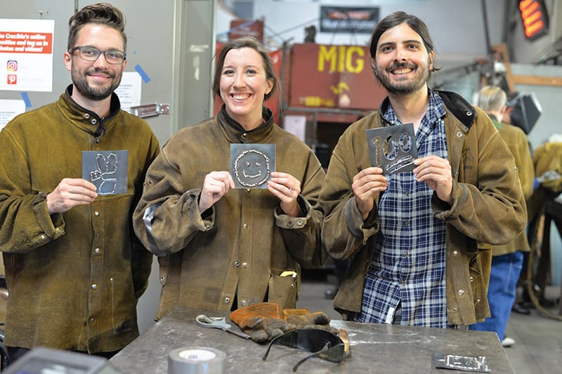 Participants learn the basics of wire-feed welding while creating a phone stand or business cardholder. First, they will bend steel sheet metal, then MIG-weld it together to a practical and unique piece.