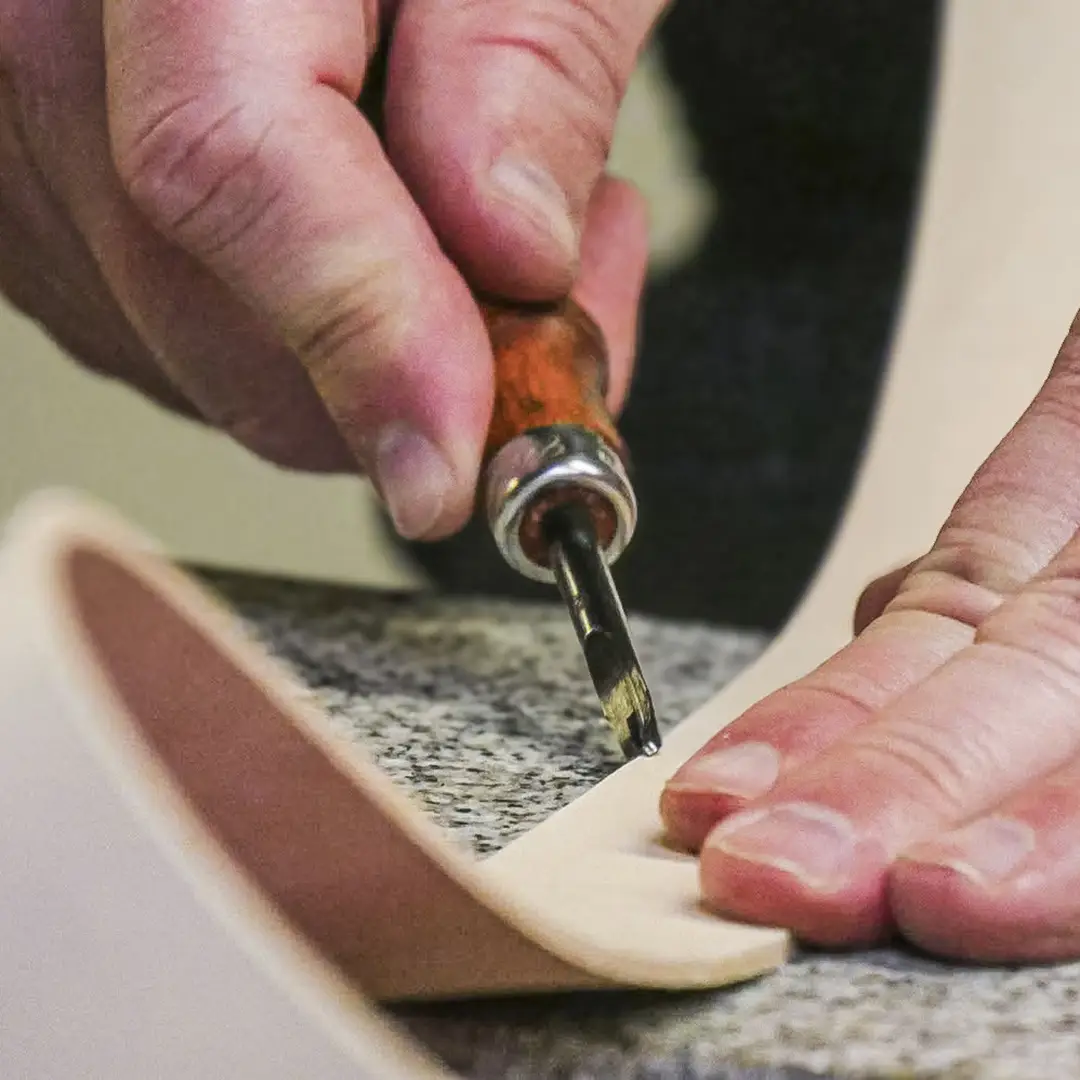 | Burnisher | A burnisher is used to smooth and harden the edges of leather. It is usually made of wood and smooths leather through applied friction and pressure. |