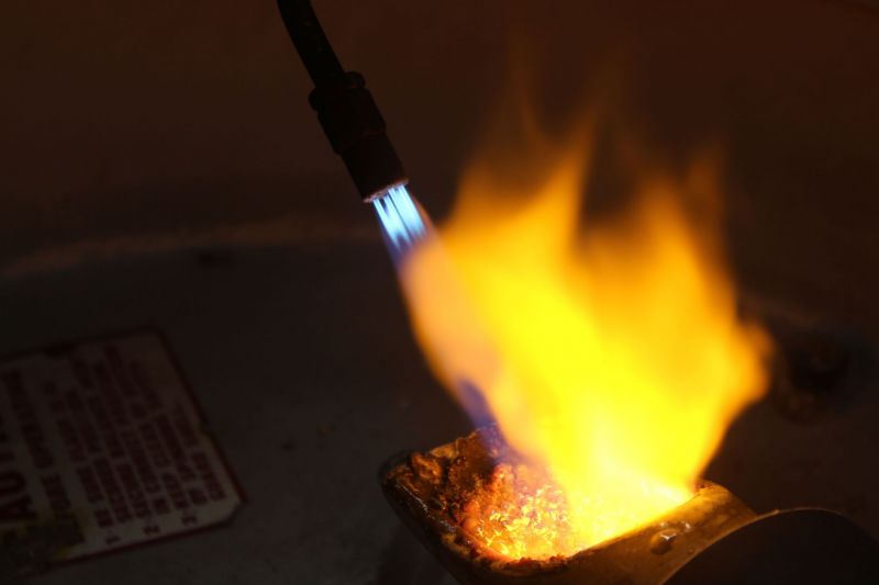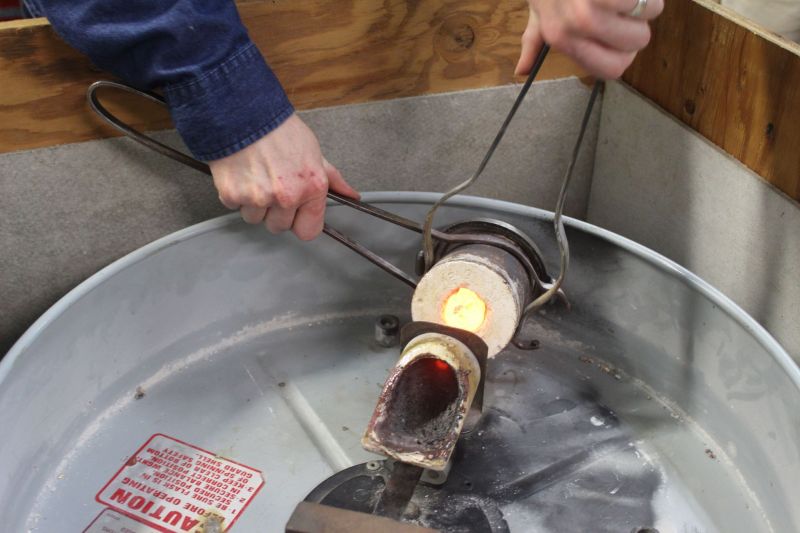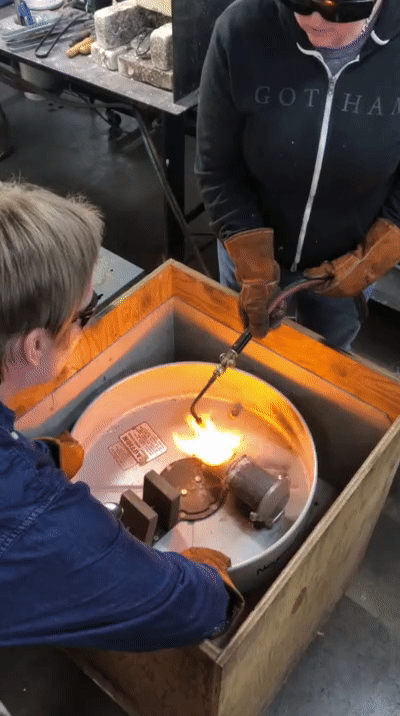 Lock the centrifuge, place your flask in the cradle, and push the crucible up against the flask. Preheat the crucible, then pour your pre-weighed metal into it. Using an oxy-acetylene torch, melt the metals in your crucible and occasionally stir with a stirring rod. When the metals are completely melted, unlock the centrifuge, activating it, and flood the molten metal into your flask. The centrifuge will spin for about one minute. Remove your flask from the cradle using tongs (it’s hot!).