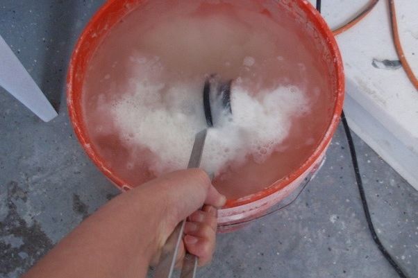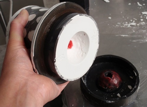 After your flask cools and is no longer glowing red, pick up your flask with a pair of tongs and completely submerge it in the quenching bucket until the bubbling stops. Try to keep your flask horizontal so your casting does not slip out and fall to the bottom of the bucket. Scrape the soft investment out of the flask and extract your casting.