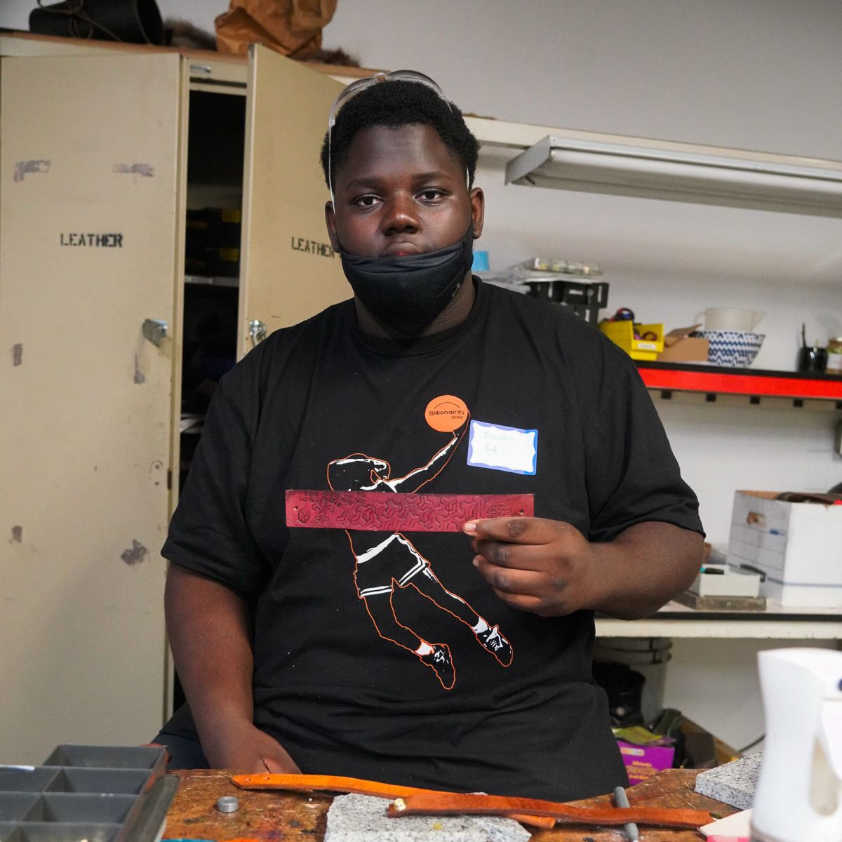McClymonds High Schoolers learned new skills in six different areas—MIG Welding, Glass Flameworking, Blacksmithing, Glass Fusing, Leatherworking, and Ceramics. Brandon, a first-time participant in the Leatherworking class, created a set of one-of-a-kind bracelets decorated with stamps and dye. It was a class he’d been eager to take.