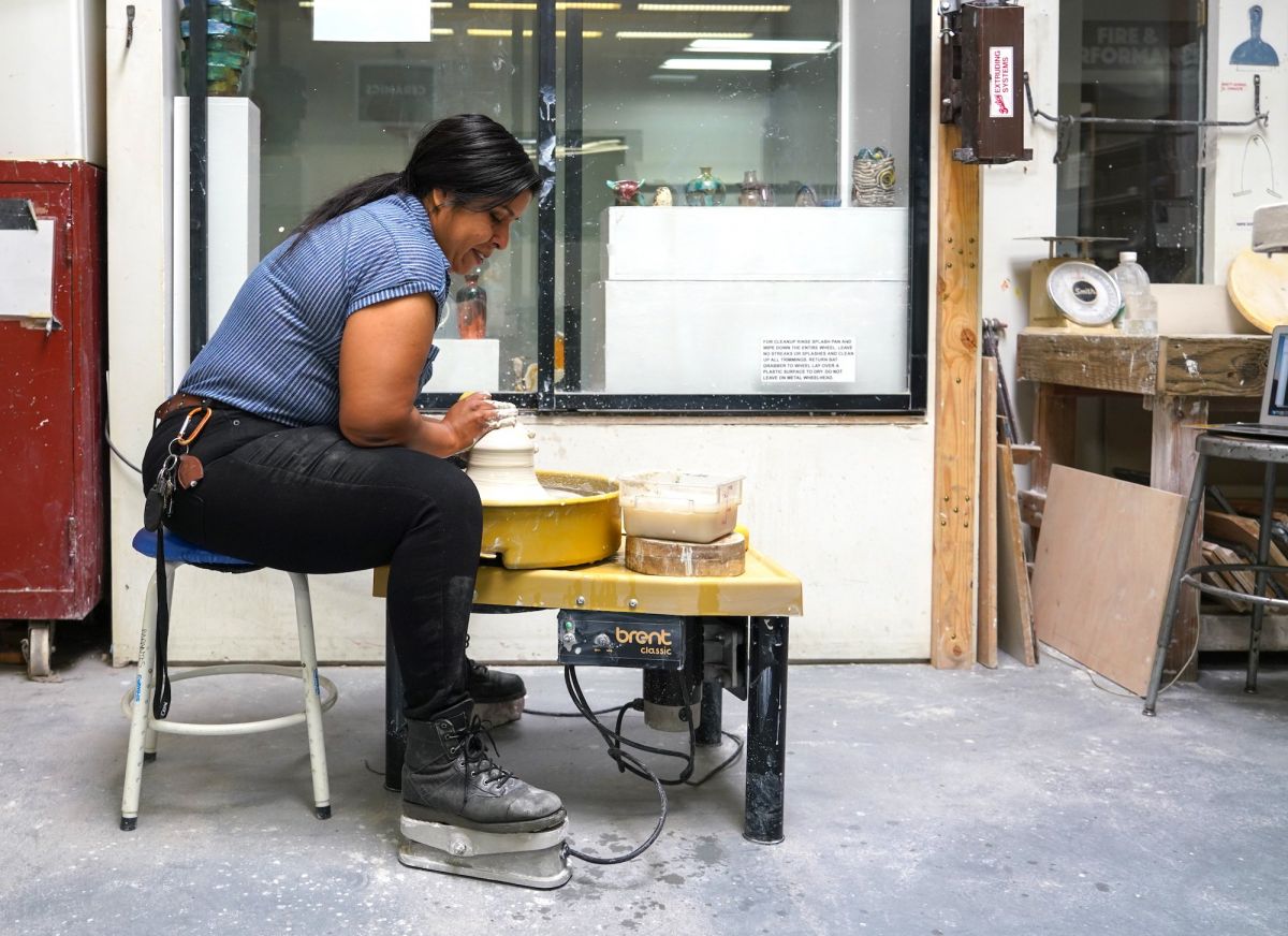Rosa Dorantes, The Crucible’s Ceramics Department Head, has been working with clay since she was in 7th grade. She proudly remembers having her early ceramics work displayed at her local mall, and stuck with ceramics throughout high school and college. Now, Rosa is proud to be expanding our ceramics studio, doubling the square footage and bringing a long-awaited update to the department—eight new pottery wheels.