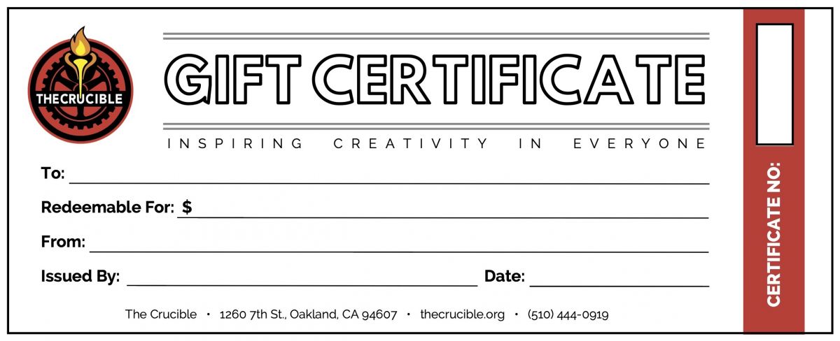 Share The Crucible with a friend or loved one! Gift certificates can be used for both Crucible classes and memberships. Digital gift certificates, available for immediate use, can be purchased for any denomination starting at $15. The Crucible no longer offers physical gift certificates, but you can download one to be printed at home for your gift-giving purposes. Please note that gift certificates are only valid with a verification code.