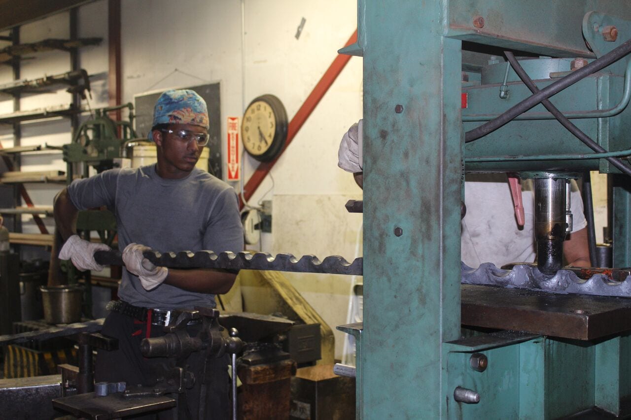 Pre-Apprentice student Abdollah Hamdan, age 20, first started taking classes at The Crucible at 12 years old. For him, the hardest part of building the archway was overcoming his fear in the shop. “I had a phobia after a bad accident and I didn’t want to go anywhere near the machines. At the start of the program, whenever the hydraulic press would be on, I couldn’t be in the same room . . . But by the end, I was using the press! I was able to overcome my fears, because of my friends’ encouragement.”