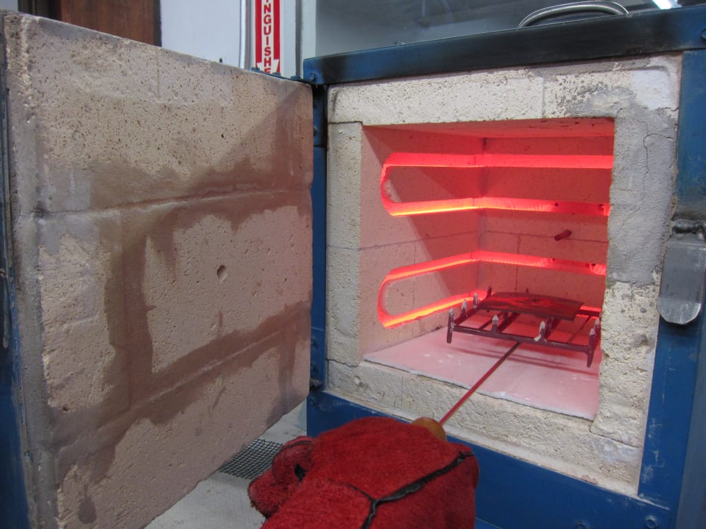 Put on your safety glasses and gloves before opening the 1500° kiln.