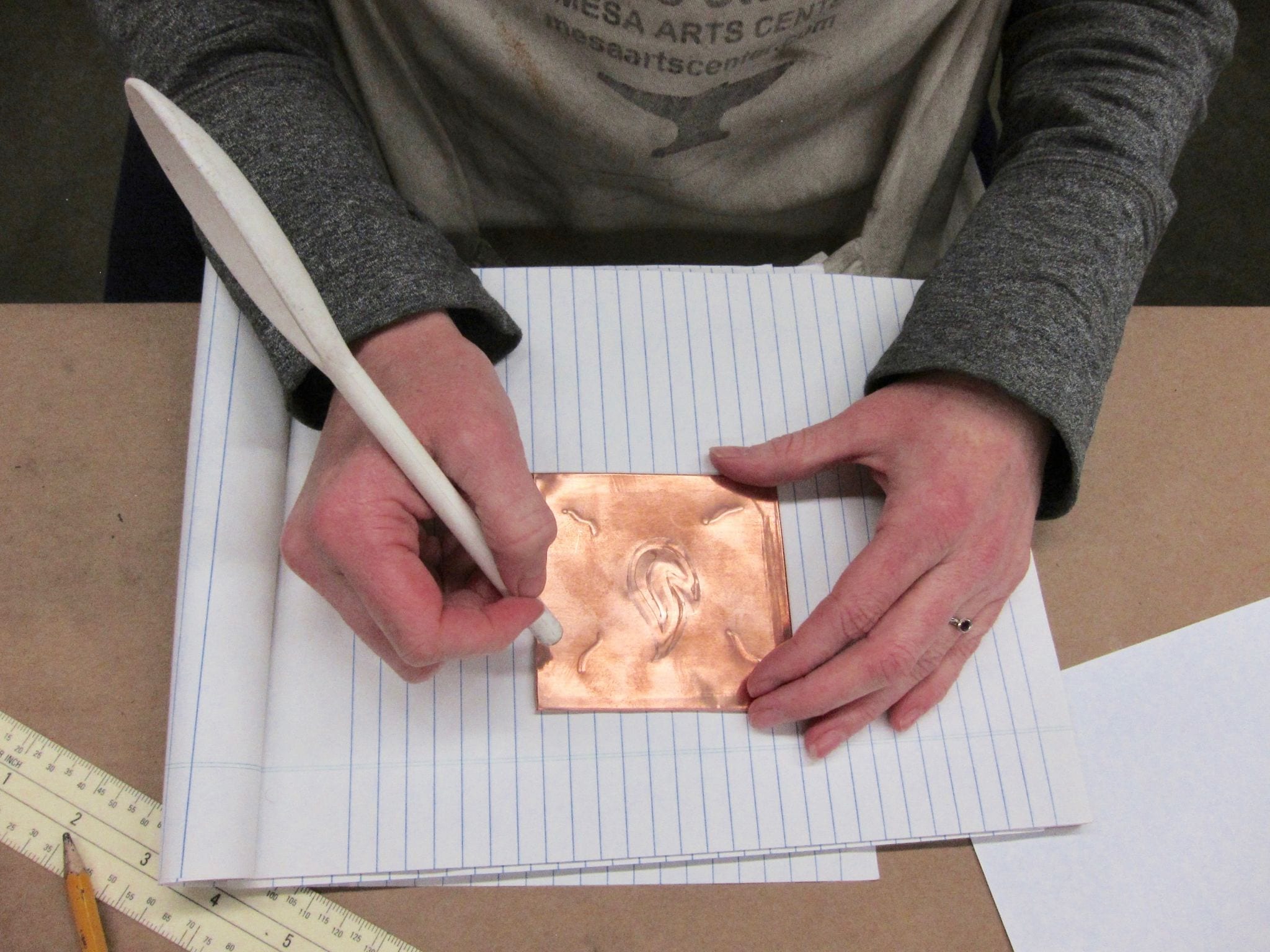 Create an embossed pattern on your copper tile by pressing into the copper with a wooden tool. It’s a bit like drawing in 3D.