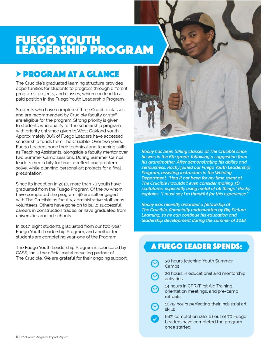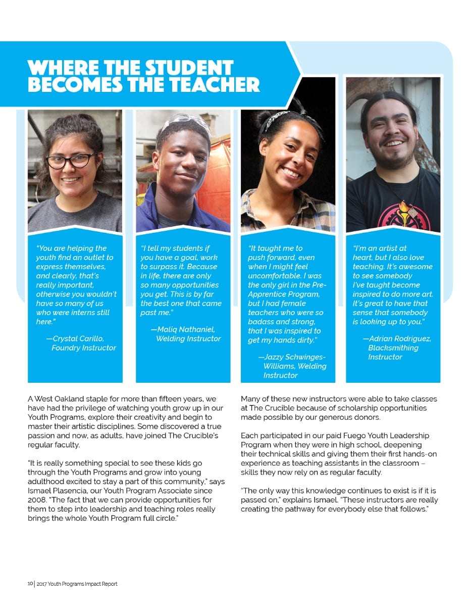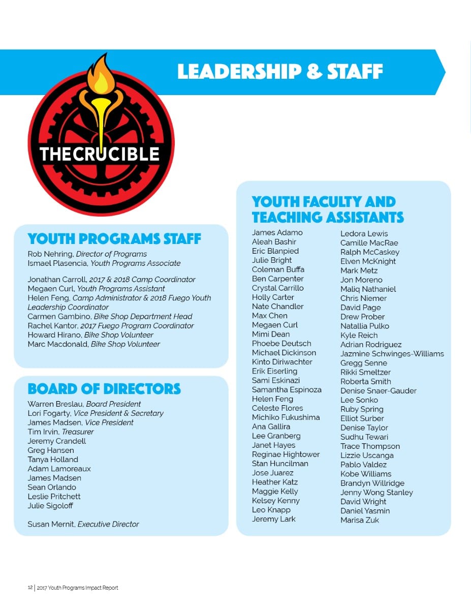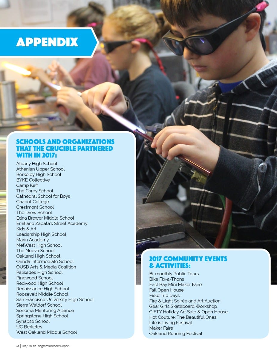 More than 5,500 young people participated in hands-on STEAM learning and original art-making at our space in West Oakland this past year. More than half of those young folks were Oakland residents who participate at a free or reduced cost in our community events and after-school, weekend, and summer programs. We’ve been doing this work for more than thirteen years, and have had the privilege of seeing young people who start in elementary or middle school become teenage Fuego Leaders, evolve into Crucible teaching assistants, then professional instructors.